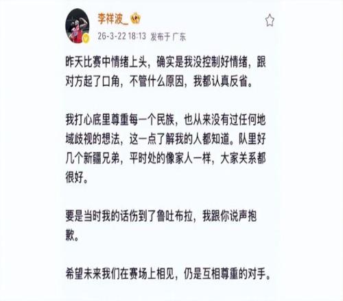 在意识到事情的严重性后,李祥波也是在网上发声进行了公开道歉:“我打心底里尊重每一个民族,也从来没有过任何地域歧视的想法。”“要是当时我的话伤到了鲁吐布拉,我跟你说声抱歉”。